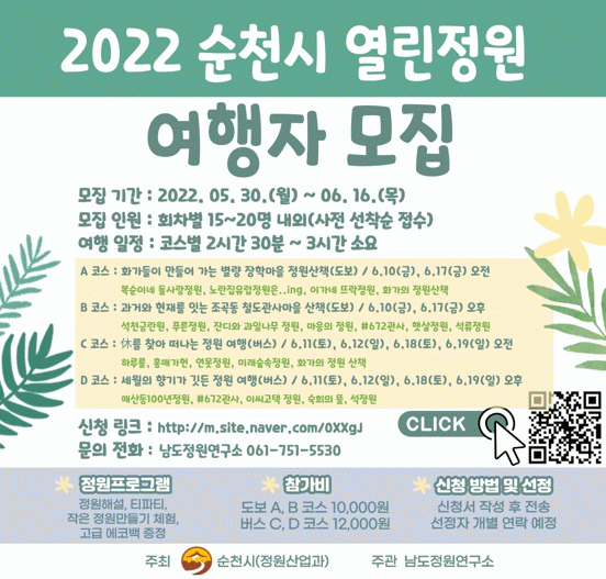 ¿¸°Á¤¿ø ¿©ÇàÀº Á¤¿øÁÖÀÇ »î°ú À̾߱Ⱑ ´ã°ÜÀÖ´Â Á¤¿øµéÀ» °³¹æÇÔÀ¸·Î½á °ü±¤°´µé°ú ¼ÒÅ롤°ø°¨ÇÏ´Â Á¤¿ø °ü±¤ ÄÜÅÙÃ÷·Î, ¼øÃµ½Ã°¡ 2017³âºÎÅÍ ÃßÁøÇϰí ÀÖ´Â °³¹æÁ¤¿øÀ¸·Î µî·ÏµÈ °³ÀÎÁ¤¿øÀ» ¿¬°èÇÏ¿© ¿î¿µÇÑ´Ù.