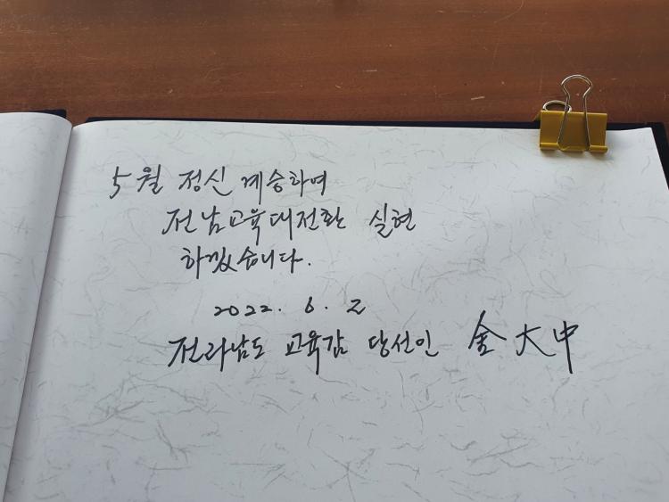 ±è ´ç¼±ÀÎÀº ¡°Àü³²±³À° À§±â¸¦ ±³À° ´ëÀüȯÀ¸·Î ±Øº¹ÇÏÀÚ´Â ´ÙÁüÀ» Çϱâ À§ÇØ ´ç¼± ÈÄ Ã¹ ÀÏÁ¤À¸·Î 5¡¤18 ±¹¸³ ¹¦Áö¸¦ ã¾Ò´Ù¡±¸ç ¡°°¢¿À¸¦ »õ·Ó°Ô ´ÙÁö°í ¿ÀÁ÷ ¿ì¸® Çлýµé°ú ±³Á÷¿øÀ» À§ÇØ ³ë·ÂÇϰڴ١±°í ¹àÇû´Ù.