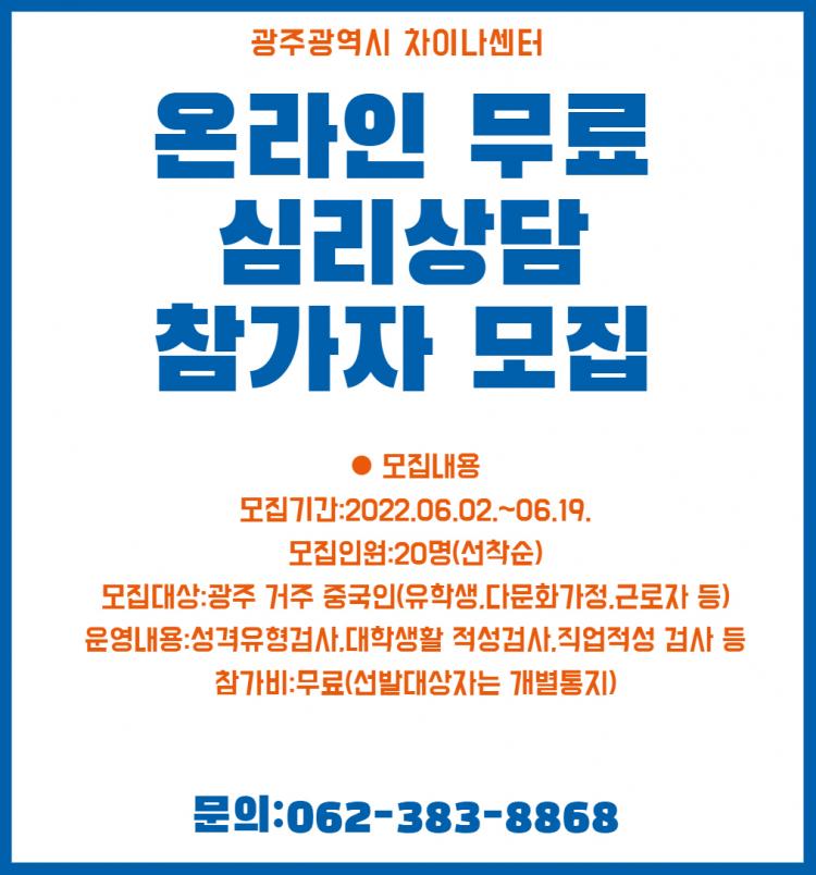 ¡®Ã£¾Æ°¡´Â »ó´ã¼¾ÅÍ¡¯´Â 6¿ù2ÀÏ~19ÀϱîÁö 20¸íÀ» ¼±Âø¼ø ¸ðÁýÇϸç, Â÷À̳ª¼¾ÅÍ È¨ÆäÀÌÁö¸¦ ÅëÇØ ½ÅûÇÏ¸é µÈ´Ù. ±âŸ ÀÚ¼¼ÇÑ »çÇ×Àº ±¤ÁÖ Â÷À̳ª¼¾ÅÍ(062-383-8868)·Î ¹®ÀÇÇÏ¸é µÈ´Ù.