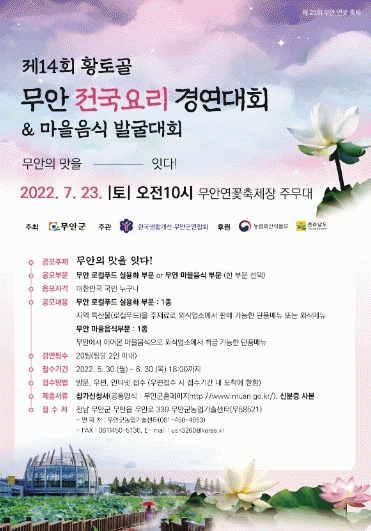 ¡®¹«¾ÈÀÇ ¸ÀÀ» ÀÕ´Ù!¡¯¶ó´Â ÁÖÁ¦·Î ÁøÇàµÇ´Â À̹ø ´ëȸ´Â ¹«¾È Ư»ê¹°ÀÎ ¿¬, ¾çÆÄ, °í±¸¸¶, ¹ãÈ£¹Ú µîÀ» ÀÌ¿ëÇÑ ¿ä¸®°æ¿¬À¸·Î ´ëÇѹα¹ ±¹¹Î ´©±¸³ª Âü¿© °¡´ÉÇÏ´Ù.