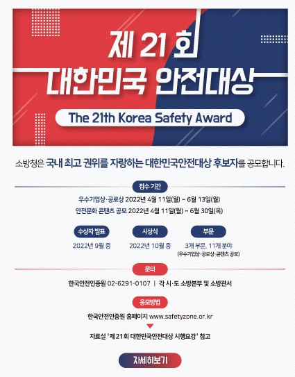 ¡®´ëÇѹα¹ ¾ÈÀü´ë»ó¡¯Àº ±¹¹Î°ú ±â¾÷ÀÇ ÀÚÀ²ÀûÀÎ ¾ÈÀü°ü¸®¸¦ À¯µµÇÏ°í ¾ÈÀüÇÑ ±â¾÷°æ¿µ ¹®È¿¡ ¾ÕÀå¼± ±â¾÷°ú ´Üü, À¯°øÀÚ¸¦ ǥâÇϱâ À§ÇÑ ±¹³» ¾ÈÀüºÐ¾ß ÃÖ°í ±ÇÀ§ÀÇ »óÀÌ´Ù.°ø¸ð ºÎ¹®Àº ¡ã ¿ì¼ö±â¾÷»ó 6°³ ºÐ¾ß(¼ºñ½º, °ø°ø¼ºñ½º, ¿¡³ÊÁö, Á¦Á¶, ¿î¼ö¡¤Ã¢°í¡¤Åë½Å, °Ç¼³) ¡ã °ø·Î»ó 3°³ ºÐ¾ß(°³ÀÎ, ´Üü, ¿ì¼öÁ¦Ç°) ¡ã ÄÜÅÙÃ÷ °ø¸ð»ó 2°³ ºÐ¾ß(UCC, À¥Å÷)ÀÌ´Ù.