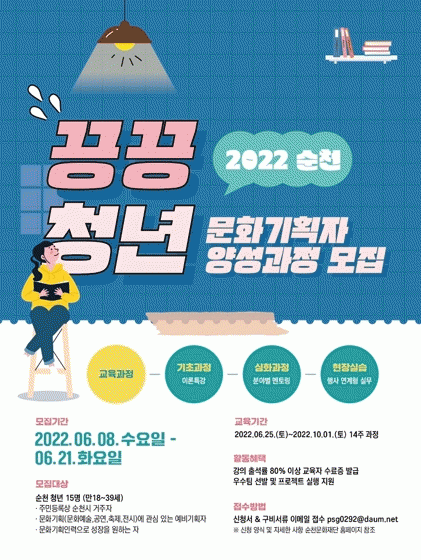 °ÀǺ° ÀÚ¼¼ÇÑ ³»¿ë°ú ÀÏÁ¤Àº ¼øÃµ¹®ÈÀç´Ü ´©¸®Áý¿¡¼ È®ÀÎÇÒ ¼ö ÀÖÀ¸¸ç, Âü¿©¸¦ ¿øÇÏ´Â ¼øÃµ û³âÀº ½Åû¼¿Í ±¸ºñ¼·ù¸¦ °®Ãç À̸ÞÀÏ Á¢¼öÇÏ¸é µÈ´Ù.