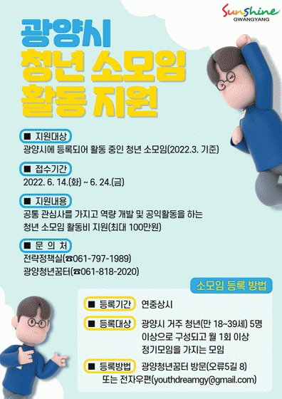 Âü¿©¸¦ Èñ¸ÁÇϴ û³â ¼Ò¸ðÀÓÀº Ȱµ¿°èȹ¼ µî ±¸ºñ¼·ù¸¦ ÁغñÇØ ¿À´Â 24ÀϱîÁö ±¤¾çû³â²ÞÅ͸¦ ¹æ¹®ÇØ Á¢¼öÇÏ¸é µÇ¸ç, ÀÚ¼¼ÇÑ ³»¿ëÀº ±¤¾ç½Ã ȨÆäÀÌÁö °øÁö»çÇ׿¡¼ È®ÀÎÇÒ ¼ö ÀÖ´Ù.