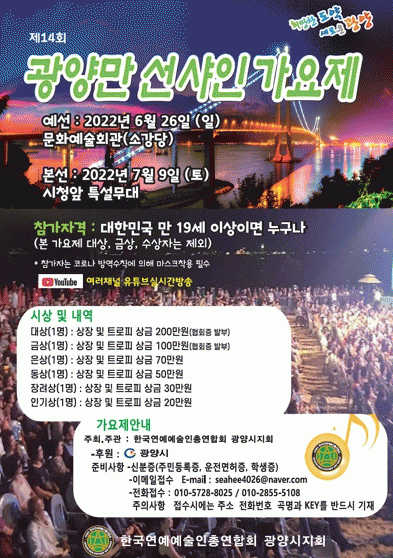 ¸¸ 19¼¼ ÀÌ»óÀÌ¸é ´©±¸³ª °¡¿äÁ¦¿¡ Âü¿©ÇÒ ¼ö ÀÖÀ¸¸ç, À̸ÞÀϰú ±¤¾ç½Ã ȨÆäÀÌÁö °øÁö»çÇ׿¡ ÀÖ´Â Á¦14ȸ ±¤¾ç¸¸ ¼±»þÀÎ °¡¿äÁ¦ ºÙÀÓÆÄÀÏÀÇ ÀüȹøÈ£·Î ½Åû °¡´ÉÇÏ´Ù.
