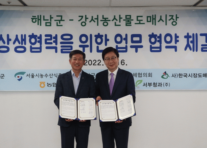 Çù¾à¿¡ Âü¼®ÇÑ °ûÁØ±æ ºÎ±º¼ö´Â¡°¼¿ï½Ã¹ÎÀÇ ¾ÈÀüÇÑ ¸Ô°Å¸®¸¦ Ã¥ÀÓÁö°í ÀÖ´Â ¼¿ï½Ã ³ó¼ö»ê½Äǰ°ø»ç¿Í ÃÖ´ë ³ó¾÷±ºÀÎ ÇØ³²ÀÌ Ã³À½À¸·Î ¾÷¹«Çù¾àÀ» ¸Î°Ô µÇ¾î ¸Å¿ì ¶æ±í´Ù¡±¸ç¡°Çس²ÀÇ Ç°Áú ÁÁÀº ³ó»ê¹°À» À¯Åë´Ü°è¸¦ ÁÙ¿©¼ °æÀï·Â ÀÖ´Â °¡°ÝÀ¸·Î °ø±ÞÇÏ°Ô µÇ¾î ÆÇ·ÎÈ®´ë¿¡ »õ·Î¿î Ȱ·ÂÀ» ºÒ¾î³ÖÀ» °ÍÀ¸·Î ±â´ëµÈ´Ù.¡±°í ¹àÇû´Ù.