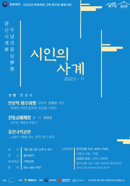 ÇÑÆí, ¡®½ÃÀÎÀÇ »ç°è¡¯´Â ±¤»ê±¸°¡ ÁÖÃÖÇÏ°í ¹®ÈÀçû¡¤±¤ÁÖ±¤¿ª½Ã°¡ Áö¿øÇÑ´Ù. Áö³ 5¿ù ¿ë¾Æ»ý°¡¿¡¼ ¡®ÀÚ³à¿Í ÇÔ²²ÇÏ´Â Àι®ÇÐ ¸¶ÁÖ¿©Ç࡯À» ÁÖÁ¦·Î ¿ÃÇØ ù ÇÁ·Î±×·¥ÀÌ ¼ºÈ²¸®¿¡ ¿¸° °¡¿îµ¥, ¿ÃÇØ ÇϹݱ⿡ µÎ Â÷·Ê ´õ ÇÁ·Î±×·¥À» ÁøÇàÇÒ °èȹÀÌ´Ù.
