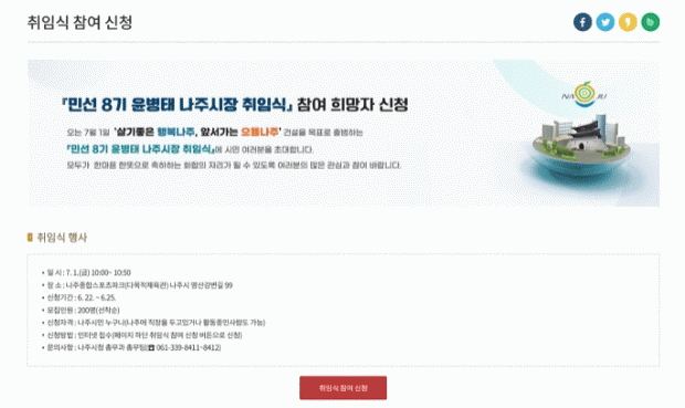 ¿©¼º±¸ ³ªÁÖ½ÃÀåÁ÷ ÀμöÀ§¿øÀåÀº ¡°12¸¸ ½Ã¹ÎÀÇ ±â´ë¸¦ ´ã¾Æ Äڷγª19ÀÇ ±ä ÅͳÎÀ» Áö³ª ¼ÒÅë°ú ÈÇÕÀ» ÃÖ¿ì¼±ÀÇ °¡Ä¡·Î ¡®´õ Å« ³ªÁÖ, ³ªÁÖ ´ëÀüȯ¡¯ÀÇ Ã»»çÁøÀ» ¹àÈ÷´Â ÃëÀÓ½ÄÀÌ µÉ °Í¡±À̶ó¸ç ¡°¹Î¼± 8±â ½ÃÁ¤ÀÇ Ã¹ ¹ß°ÉÀ½À» ³»µó´Â ¶æ±íÀº ÀÚ¸®¿¡ ¸¹Àº ½Ã¹ÎµéÀÇ °ü½É°ú Âü¿©¸¦ ºÎʵ台´Ù¡±°í ¹àÇû´Ù.