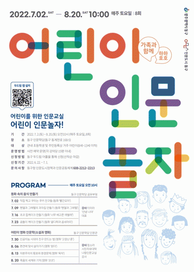 °¢ ÇÁ·Î±×·¥Àº 7¿ù 2ÀϺÎÅÍ 8¿ù 13ÀϱîÁö ¸ÅÁÖ Åä¿äÀÏ ¿ÀÀü 10½Ã µ¿±¸ Àι®ÇÐ´ç ³» °øÀ¯ ºÎ¾ý°ú Àι®°ü¿¡¼ °¢°¢ ÁøÇàµÇ¸ç, µ¿±¸ °ÅÁÖ 8~13¼¼ ÀÌÇÏ ÃʵîÇлýÀÌ¸é ´©±¸³ª ¹«·á·Î Âü¿©ÇÒ ¼ö ÀÖ´Ù.