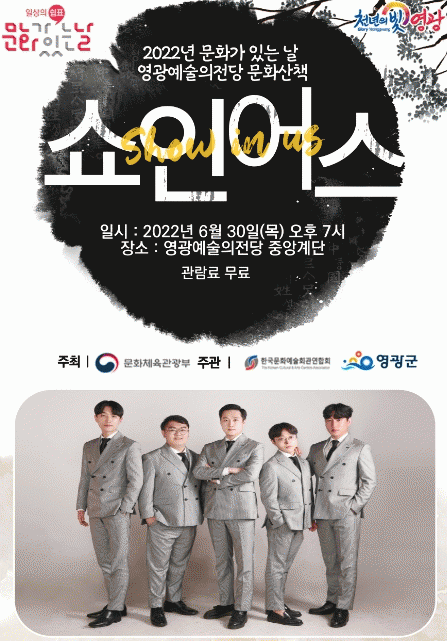 À̹ø °ø¿¬Àº Çѱ¹¹®È¿¹¼ú¿¬ÇÕȸÀÇ 2022³â Áö¿ª¹®È¿¹¼úȸ°ü ¹®È°¡ ÀÖ´Â ³¯ Áö¿ø °ø¸ð»ç¾÷À¸·Î ¼±Á¤µÈ °ø¿¬À̸ç, ¹®ÈüÀ°°ü±¤ºÎ¿¡¼ ÁÖÃÖÇϰí Çѱ¹¹®È¿¹¼úȸ°ü¿¬ÇÕȸ¿Í ¿µ±¤±º¿¡¼ ÁÖ°üÇÑ´Ù. °ü¶÷·á´Â ¹«·áÀÌ¸ç ¿µ±¤¿¹¼úÀÇÀü´ç ¾ß¿Ü°ø¿¬Àå(Áß¾Ó°è´Ü)À» ã¾Æ¿À½Ã¸é ´©±¸³ª °ü¶÷ÇÒ ¼ö ÀÖ´Ù.