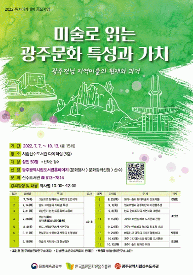 ¿î¿µ ±â°£Àº ¿À´Â 7¿ù7ÀϺÎÅÍ 10¿ù14ÀϱîÁöÀ̸ç, ¸ÅÁÖ ¸ñ¿äÀÏ ½Ã¹Î 50¸íÀ» ´ë»óÀ¸·Î °í´ë ¹Ì¼ú¿¡¼ºÎÅÍ Çö´ë¹Ì¼ú, ±¤ÁÖºñ¿£³¯·¹±îÁö ±¤ÁÖ¡¤Àü³²Áö¿ª ¹Ì¼úÀÇ ÇöÀç¿Í °ú°Å¸¦ »ìÆìº¸°í ¹Ì¼úÀÛǰÀÇ ¾Æ¸§´Ù¿ò°ú ¿ª»ç¿¡ ´ëÇÑ ½Ã¹ÎÀÇ ÅëÂû·ÂÀ» ³ôÀÏ ¼ö ÀÖ´Â ³»¿ëÀ¸·Î ÃÑ 15ȸ ÁøÇàµÈ´Ù.