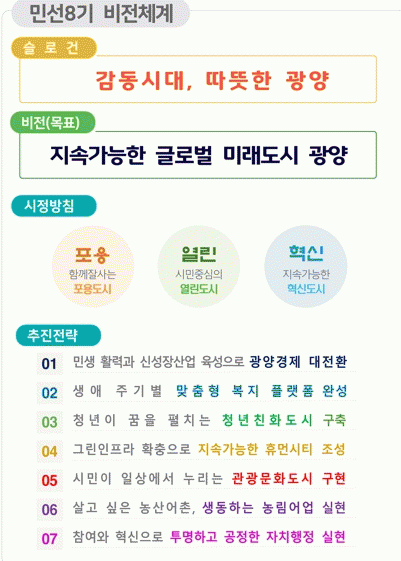 Á¤ÀÎÈ ±¤¾ç½ÃÀå ´ç¼±ÀÎÀº ¡°½ÃÁ¤ ºñÀüü°è´Â ±¤¾ç½Ã ¹Î¼± 8±â ½ÃÁ¤ÀÇ ¹æÇâ°ú ¸ñÇ¥¸¦ Ç¥ÇöÇÑ ÇÙ½É °¡Ä¡ÀÌ´Ù¡±¸ç, ¡°½Ã¹ÎÀÇ ¹Ù¶÷°ú °°ÀÌ ÇÑ »ç¶÷µµ ¼Ò¿ÜµÇÁö ¾Ê´Â µû¶æÇÑ ±¤¾ç, ¸ðµÎ°¡ ÇູÇÑ °¨µ¿½Ã´ë¿Í Áö¼Ó °¡´ÉÇÑ ±Û·Î¹ú ¹Ì·¡µµ½Ã¸¦ ½Ã¹Î°ú ÇÔ²² ¸¸µé¾î°¡°Ú´Ù¡±°í ¸»Çß´Ù.