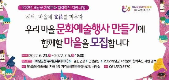 ¹®ÈüÀ°°ü±¤ºÎ °ø¸ð Áö¿ª¹®È Ȱ·ÂÃËÁø Áö¿ø»ç¾÷À¸·Î ÃßÁøÇϴ¡®Çس², ¸¶À»¿¡ Ùþü£¸¦ ÇÇ¿ì´Ù¡¯»ç¾÷Àº ÁֹεéÀÌ Áß½ÉÀÌ µÇ¾î ÇØ³²ÀÇ ¸¶À» °÷°÷¿¡ ¼û°ÜÁø ¸¶À» °íÀ¯ÀÇ ¹®È¿¹¼ú, ¿ª»ç, ¼¼½Ãdz¼Ó ÀÚ¿øµéÀ» ¹ß±¼Çϰí, ¸¶À»ÀÇ ´ëÇ¥ ¹®È¿¹¼úÇà»ç·Î ¸¸µé¾î ³ª°¡°Ô µÈ´Ù.