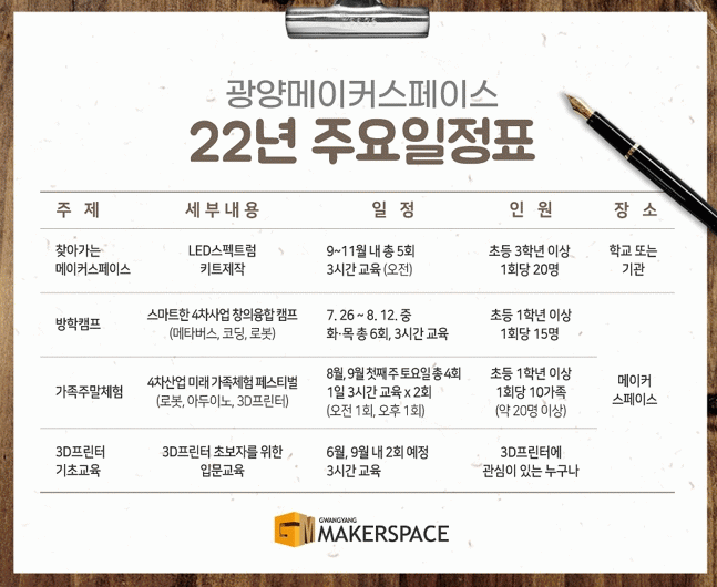 2022³â¿¡´Â ã¾Æ°¡´Â ¸ÞÀÌÄ¿½ºÆäÀ̽º, ½º¸¶Æ®ÇÑ 4Â÷»ê¾÷ âÀÇÀ¶ÇÕÄ·ÇÁ, 4Â÷»ê¾÷ ¹Ì·¡ °¡Á·Ã¼Çè Æä½ºÆ¼¹ú, 3DÇÁ¸°ÅÍ ±âÃʱ³À° µî ½Ã¹ÎÀ» À§ÇÑ ±³À°°ú ½ÃÁ¦Ç° Á¦ÀÛ µî ´Ù¾çÇÑ ÇÁ·Î±×·¥À» ¿î¿µÇÒ °èȹÀÌ´Ù.