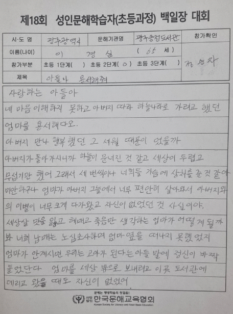 ƯÈ÷ ¿ì¼ö»óÀ» ¼ö»óÇÑ À̰æ½É(ÃʵîÇзÂÀÎÁ¤ ¼ºÀα³À° 2´Ü°è) ¾î¸£½ÅÀº »çº° ÈÄ Èûµé¾îÇÏ´Â ¾ö¸¶°¡ »õ·Î¿î ¿ë±â¸¦ °¡Áú ¼ö ÀÖ°Ô ¹®Çر³½Ç¿¡ Âü¿©Çϵµ·Ï µµ¿ÍÁØ ¾Æµé¿¡ ´ëÇÑ °í¸¶¿ò°ú ¹Ì¾ÈÇÔÀ» ´ã¾Æ ÆíÁö·Î Ç¥ÇöÇß´Ù.