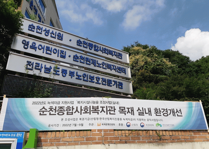 ¼øÃµÁ¾ÇÕ»çȸº¹Áö°üÀº À̹ø »ç¾÷À» ÅëÇØ º¹Áö°ü °´ç(¸éÀû 134.4§³)¿¡ ģȯ°æ ¸ñÀ縦 »ç¿ëÇÏ¿© õÁ¤°ú ¹Ù´Ú, º®¸éÀ» »õ ´ÜÀåÇÏ¿© Áö¿ªÁֹεéÀÌ ÄèÀûÇÏ°Ô ÀÌ¿ëÇÒ ¼ö ÀÖ´Â °ø°£À¸·Î Á¶¼ºÇÏ°Ô µÈ´Ù.