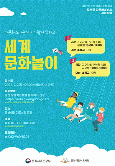 ´Ù¹®È ¾î¸°ÀÌÀÇ Á¤º¸°ÝÂ÷¸¦ ÇØ¼ÒÇÏ°í »óÈ£¹®È ÀÌÇØ °è±â¸¦ ¸¶·ÃÇϱâ À§ÇÑ °ÍÀ¸·Î, 8¿ù25ÀϱîÁö ¿î³²¾î¸°À̵µ¼°ü °´ç¿¡¼ ÃʵîÇлý ´ë»ó ¡®¼¼°è¹®ÈÀÌÇØ¡¯¿Í ¡®¼¼°è¹®È³îÀÌ¡¯¸¦ ÁøÇàÇÒ ¿¹Á¤ÀÌ´Ù.