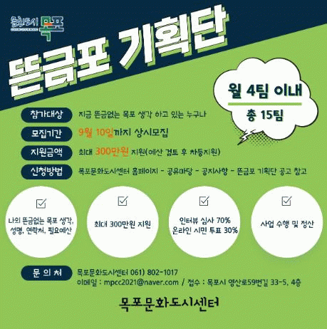 ¸ñÆ÷ ¹®È ¹ßÀüÀ» À§ÇÑ ¶á±Ý¾ø´Â »ý°¢ÀÌ ÀÖ´Â ½Ã¹Î ´©±¸³ª Âü¿©¸¦ ½ÅûÇÒ ¼ö Àִµ¥ ¹®Èµµ½Ã¼¾ÅÍ´Â ¿À´Â 9¿ù±îÁö »ó½Ã ¸ðÁýÇÑ´Ù.