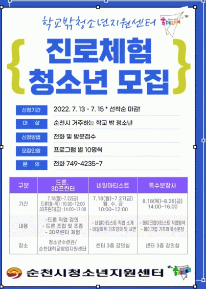 ¼øÃµ¿¡ ÁÖ¼Ò¸¦ µÎ°í ÀÖ´Â Çб³ ¹Û û¼Ò³âÀ̶ó¸é ´©±¸³ª Âü¿© °¡´ÉÇϸç, ¿À´Â 15ÀϱîÁö °¢ ºÐ¾ßº° 10¸í¾¿ ¸ðÁýÇØ ¿î¿µÇÒ °èȹÀÌ´Ù.