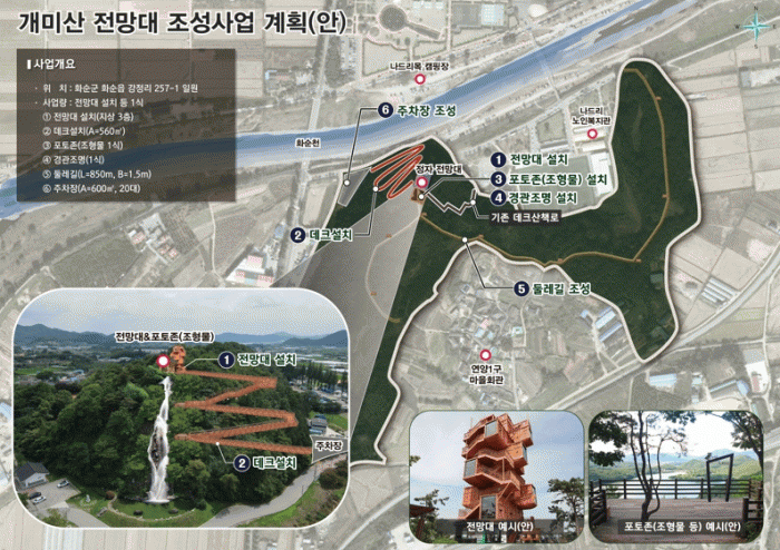 ¾ß°£¿¡µµ ¾ÈÀüÇÏ°Ô »êÃ¥ÇÒ ¼ö ÀÖ´Â °æ°üÁ¶¸í, º¸Çà ¾àÀÚ¸¦ À§ÇÑ °³¹Ì»ê µÑ·¹±æ, Â÷·®À» ÀÌ¿ëÇØ Àü¸Á´ë¸¦ ã´Â Áö¿ª Áֹΰú °ü±¤°´À» À§ÇÑ ÁÖÂ÷Àå(600m©÷) µîÀ» Á¶¼ºÇÒ ¿¹Á¤ÀÌ´Ù.