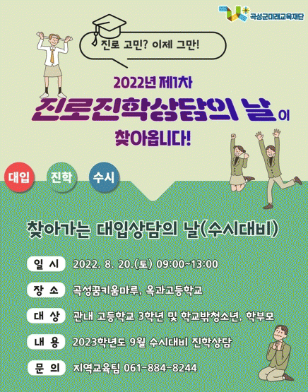 Á¦1Â÷ ÁøÇлó´ãÀº ¡®Ã£¾Æ°¡´Â ´ëÀÔ»ó´ãÀÇ ³¯·Î 2023Çг⵵ 9¿ù ¼ö½Ã¿ø¼ Á¢¼ö ´ëºñ¸¦ À§ÇØ °î¼º °ü³» °íµîÇб³ 3ÇÐ³â ¹× Çб³ ¹Û û¼Ò³â, Çкθ𸦠´ë»óÀ¸·Î 9:00½ÃºÎÅÍ 13:00½Ã±îÁö ÁøÇàµÇ¸ç, »ó´ã½ÅûÀº °¢ ÇØ´ç °íµîÇб³¿Í °î¼º±ºÇб³¹Ûû¼Ò³âÁö¿ø¼¾ÅÍ¿¡¼ 7¿ù 27ÀϱîÁö ½ÅûÀ» ¹Þ´Â´Ù.
