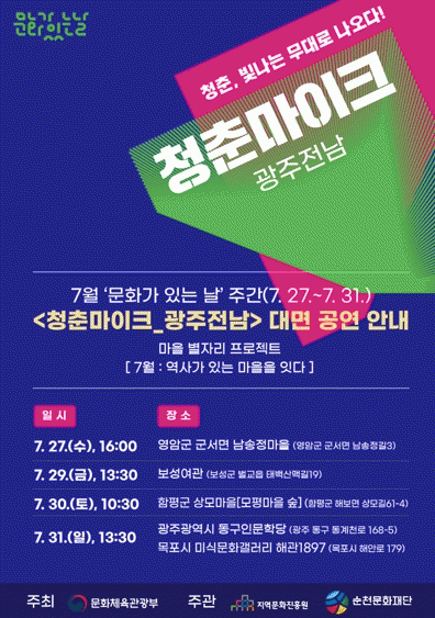 ¡®Ã»ÃḶÀÌÅ©_±¤ÁÖÀü³²¡¯ 7¿ù °ø¿¬ °ü¶÷Àº ´©±¸³ª °¡´ÉÇϸç, ±âŸ ÀÚ¼¼ÇÑ »çÇ×Àº ¼øÃµ¹®ÈÀç´Ü ´©¸®Áý¿¡¼ È®ÀÎÇÒ ¼ö ÀÖ´Ù.