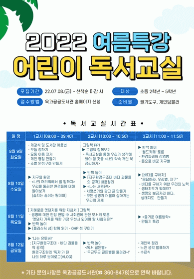ÇØ´ç ±â°£¿¡´Â ¹Ù´Ù¸¦ ÁöÄѶó¶ó´Â ÁÖÁ¦·Î ÇÏ´Â µµ¼°ü µ¶¼ ±³½Ç, Ã¥ Àд ¸¶¹ý»ç ¸¶¼ú °ø¿¬ ¹× üÇè, µµ¼°ü ¿©¸§¹Ì¼Ç 7, µµ¼°ü ÀÌ¿ë ½ºÅÆÇÁ Åõ¾î, °ø¿¹ üÇè µî ´Ù¾çÇÑ µ¶¼ ¹®È ÇÁ·Î±×·¥À» ¸¸³ªº¼ ¼ö ÀÖ´Ù.