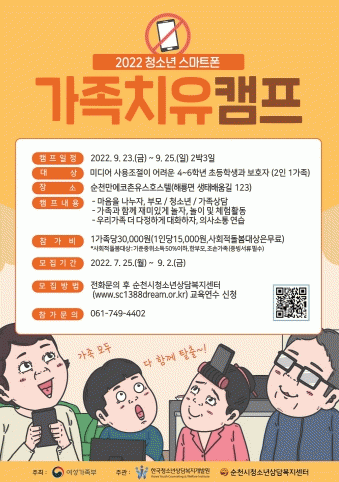 Âü°¡ ½ÅûÀº ¿À´Â 9¿ù 2ÀϱîÁö ¼øÃµ½Ã û¼Ò³â»ó´ãº¹Áö¼¾ÅÍ È¨ÆäÀÌÁö ±³À°/¿¬¼ö ½Åû¿¡¼ Á¢¼ö °¡´ÉÇÏ´Ù. Âü°¡ºñ´Â ÇÑ °¡Á·´ç 3¸¸¿øÀ̸ç, ÇѺθð¡¤Á¶¼Õ°¡Á· µî »çȸÀûµ¹º½´ë»óÀº ¹«·á·Î Âü¿© °¡´ÉÇÏ´Ù.