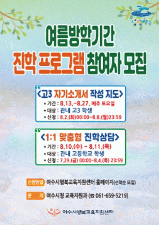 ¡®ÀÚ±â¼Ò°³¼ ÀÛ¼º °úÁ¤(40¸í)¡¯Àº 8¿ù 2ÀϺÎÅÍ 8¿ù 8ÀϱîÁö, ¡®ÁøÇлó´ã(51¸í)¡¯Àº 7¿ù 29ÀϺÎÅÍ 8¿ù 4ÀϱîÁö ¿©¼ö½Ã Çູ±³À°Áö¿ø¼¾ÅÍ È¨ÆäÀÌÁö¿¡¼ ¼±Âø¼øÀ¸·Î ½ÅûÇÏ¸é µÈ´Ù.