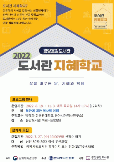 ±¤¾ç¿ë°µµ¼°üÀº Áö³ 4¿ù »ç¾÷ ¼öÇà±â°üÀ¸·Î ¼±Á¤µÆÀ¸¸ç, 2022³â ¡®µµ¼°ü ÁöÇýÇб³¡¯´Â 8¿ù 18ÀÏ~11¿ù 3ÀÏ ¸ÅÁÖ ¸ñ¿äÀÏ ¿ÀÈÄ 2½Ã ÃÑ 12ȸ¿¡ °ÉÃÄ Àι®ÇÐ ÇÁ·Î±×·¥ÀÌ ÁøÇàµÈ´Ù.