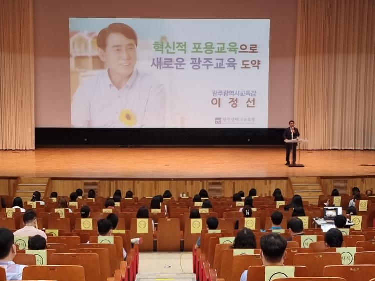 1ÀÏ ±¤ÁÖ±³À°¿¬¼ö¿ø¿¡ µû¸£¸é ÀÌ ±³À°°¨Àº ÀÌ ÀÚ¸®¿¡¼ ¡°±³À°Àº Èñ¸ÁÀÇ »ç´Ù¸®°¡ µÇ¾î¾ß ÇÑ´Ù¡±¸ç ¡°´Ü ÇѸíÀÇ ¾ÆÀ̵µ Æ÷±âÇÏÁö ¾Ê´Â Çõ½ÅÀû Æ÷¿ë±³À°À» ÅëÇØ ´õ ¾Õ¼± ±³À°, ´õ ³ÐÀº ±³À°, ´õ ±íÀº ±¤ÁÖ±³À°À» ¿°Ú´Ù¡±°í Æ÷ºÎ¸¦ ¹àÇû´Ù.