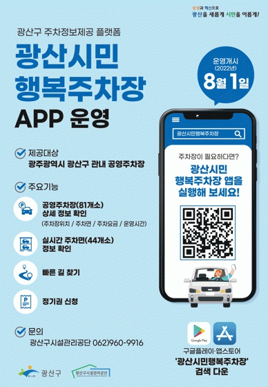 À̸¦ ÅëÇØ ¼±º¸ÀÌ´Â ¡®±¤»ê½Ã¹ÎÇູÁÖÂ÷À塯Àº ±¤»ê±¸ °ü³» ÃÑ 81°³¼Ò °ø¿µ ¹× °øÀ¯ÁÖÂ÷Àå Á¤º¸¸¦ ´ã°í ÀÖ´Ù. ÁÖÂ÷Àå À§Ä¡ºÎÅÍ ÁÖÂ÷¸é, ÁÖÂ÷¿ä±Ý, ¿î¿µ½Ã°£ µî »ó¼¼ Á¤º¸¸¦ È®ÀÎÇÒ ¼ö ÀÖ´Ù.