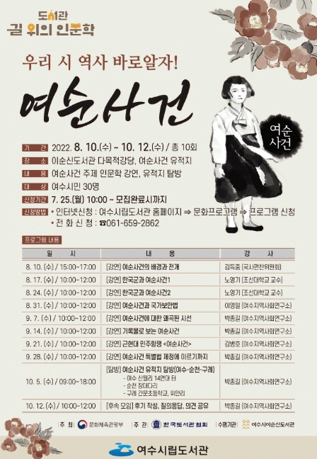 ¡®¿ì¸®½Ã ¿ª»ç ¹Ù·Î¾ËÀÚ! ¿©¼ø»ç°Ç¡¯À̶ó´Â ÁÖÁ¦·Î 8¿ù 10ÀϺÎÅÍ 10¿ù 12ÀϱîÁö ÆîÃÄÁö´Â À̹ø ÇÁ·Î±×·¥Àº °¿¬(8ȸ)°ú À¯ÀûÁö ޹æ(1ȸ), ÈļӸðÀÓ(1ȸ) µîÀ¸·Î ÁøÇàµÈ´Ù.