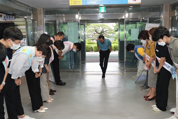 À̳¯ Çà»ç´Â ±è¼º ±º¼ö, °£ºÎ °ø¹«¿ø, ³ëµ¿Á¶ÇÕ ÀÓ¿ø, ½Å±Ô °ø¹«¿ø µî 30¿© ¸íÀÌ ¡°¾È³çÇϼ¼¿ä? ³»°¡ ¸ÕÀú ÀλçÇսô١±¶ó°í ÀλçÇϰí, Ãâ±ÙÇÏ´Â Á÷¿øµéµµ °°ÀÌ Àλ縦 ÇÏ¸ç ¹àÀº ¹Ì¼Ò·Î È´äÇÏ¸é¼ È±â¾Ö¾ÖÇÑ ºÐÀ§±â ¼Ó¿¡¼ ÁøÇàµÆ´Ù.