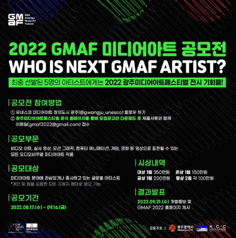 ¹Ìµð¾î¿¹¼ú°¡ÀÇ ¼ºÀå°ú µµÀüÀ» Áö¿øÇϰíÀÚ ¡®WHO IS NEXT GMAF ARTIST?¡¯À» ½½·Î°ÇÀ¸·Î ÁøÇàµÇ´Â Àü¹®°¡ °ø¸ðÀü¿¡´Â ¹Ìµð¾î¾ÆÆ® ºÐ¾ß¿¡ °ü½É ÀÖ´Â °³ÀÎ ¹× ÆÀÀ» Æ÷ÇÔÇÑ ±¹³»¿Ü ¹Ìµð¾î¿¹¼ú°¡ ´©±¸³ª Âü¿© °¡´ÉÇÏ´Ù.