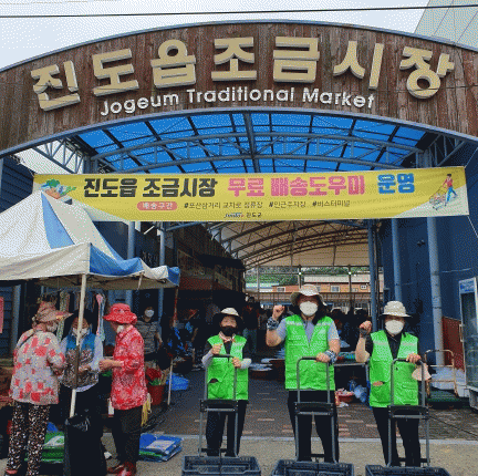ÁøµµÀ¾ Á¶±Ý½ÃÀåÀ» ¹æ¹®ÇÏ´Â ¾î¸£½Å°ú °Åµ¿ÀÌ ºÒÆíÇÑ ½ÃÀå À̿밴µéÀ» ´ë»óÀ¸·Î 3¸íÀÇ ¹è¼Û µµ¿ì¹Ì°¡ Àα٠ÁÖÂ÷ÀåÀ̳ª ¹ö½ºÁ¤·ùÀå±îÁö ±¸ÀÔÇÑ ¹°°ÇÀ» ¹«·á·Î ¿î¹ÝÇØ ÁÖ°í ÀÖ´Ù.