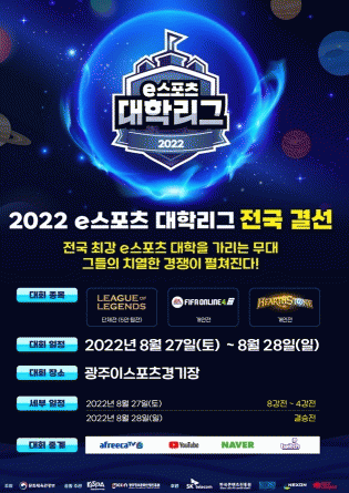 ¡®e½ºÆ÷Ã÷ ´ëÇи®±×¡¯´Â ´ëÇÐ e½ºÆ÷Ã÷ Ȱ¼ºÈ¸¦ À§ÇØ ¾Æ¸¶Ãß¾î ±â¹Ý È®º¸¿Í ´ëÇлý ´ë»ó »ê¾÷ ÀÌÇØµµ¸¦ ³ôÀ̱â À§ÇÑ ¸¶·ÃÇÑ ´ëȸ´Ù. ¿ÃÇØ Àü±¹ °á¼±Àº ¹®ÈüÀ°°ü±¤ºÎ°¡ ÁÖÃÖÇϰí Çѱ¹e½ºÆ÷Ã÷Çùȸ(ÀÌÇÏ Çùȸ)¿Í ±¤ÁÖÁ¤º¸¹®È»ê¾÷ÁøÈï¿øÀÌ °øµ¿ ÁÖ°üÇÑ´Ù.