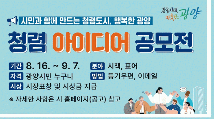 Á¦¾ÈÀ» ¿øÇÏ´Â À̴ û·ÅÇÑ °øÁ÷¹®È¿Í °ÇÀüÇÑ Áö¿ª»çȸ Á¶¼ºÀ» À§ÇÑ Á¦¾È°ú û·Å ½ÇÇö¿¡ ´ëÇÑ Ç¥¾î¸¦ ÀÛ¼ºÇØ µî±â¿ìÆí ¶Ç´Â À̸ÞÀÏ·Î Á¦ÃâÇÏ¸é µÇ°í, ½Åû¼ µî ±âŸ ÀÚ¼¼ÇÑ »çÇ×Àº ½Ã ȨÆäÀÌÁö °ø°í¿¡ °ÔÀçµÅ ÀÖ´Ù.