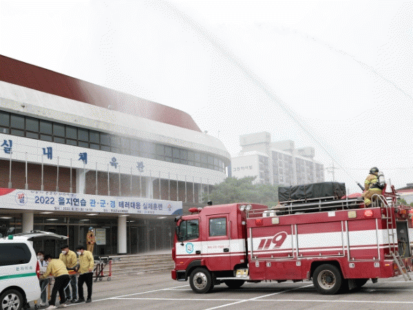 À̹ø ÈÆ·ÃÀº ÀÎ¸í±¸Á¶, ÈÀçÁø¾Ð, ½Ã¼³¹° º¹±¸ ¹× ±¸È£È°µ¿À¸·Î ÁøÇàµÇ¾úÀ¸¸ç, ½Ç³»Ã¼À°°ü¿¡ ¿øÀι̻óÀÇ Æø¹ß ¹× ÈÀç ¹ß»ýÀ» ¼³Á¤ÇÏ¿© ±º¹Î 40¿©¸íÀÌ ´ëÇÇÇÏ°í »ç»óÀÚ À̼۰ú ±¸Á¶¸¦ Á¶Ä¡ÇÏ´Â µî ½ÇÁ¦¿Í °°Àº ±ä¹ÚÇÑ ´ëÀÀ»óȲÀ» ¿¬½ÀÇÏ¿´´Ù.