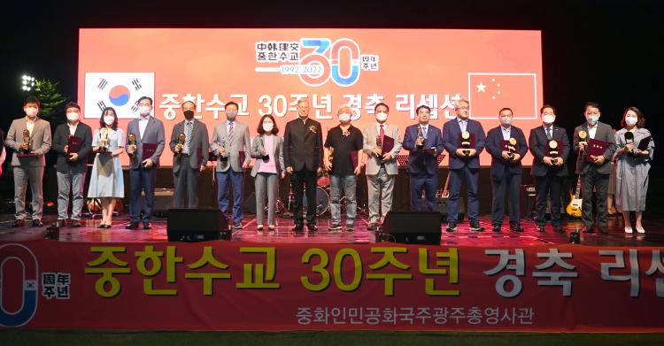 ÇÑÁß ¼ö±³ 30ÁÖ³âÀ» ¸Â¾Æ ÁÖ±¤ÁÖÁß±¹ÃÑ¿µ»ç°ü ÁÖÃÖ·Î 8¿ù 24ÀÏ ¿ÀÈÄ 7½Ã È£³²´ëÇб³ õ¿¬Àܵð¿îµ¿Àå¿¡¼ ¿¸° ¡®ÁßÇѼö±³ 30Áֳ⠰æÃà ¸®¼Á¼Ç¡¯¿¡¼ ¼Õ óÀå µî 4¸íÀÇ ±³Á÷¿øÀº ÁßÇÑ ¿ìÈ£»óÀ», Á¶°æ¿Ï ±³¼ö´Â ÁÖÇÑÁß±¹´ë»ç °¨»çÆÐ¸¦ ¼ö»óÇß´Ù.