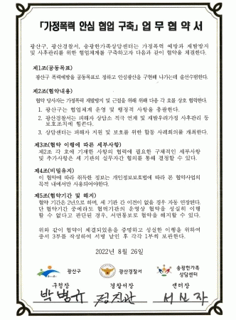 ±¤»ê±¸´Â 26ÀÏ ±¤»ê°æÂû¼, ¼Û±¤ÇѰ¡Á·»ó´ã¼¾ÅÍ¿Í ¡®°¡Á¤Æø·Â °øµ¿´ëÀÀü°è ±¸Ãà°ú Æø·Â¿¹¹æ Ȱµ¿ ¹× ÇÇÇØÀÚ º¸È£ °È¸¦ À§ÇÑ ¾÷¹«Çù¾à¡¯À» ü°áÇß´Ù.