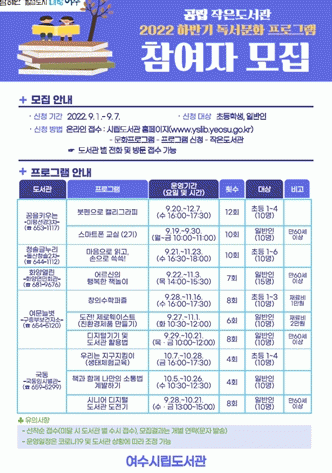 9¿ù 1ÀϺÎÅÍ 7ÀϱîÁö ¿©¼ö½Ã¸³µµ¼°ü ȨÆäÀÌÁö¿¡¼ ¿Â¶óÀÎÀ¸·Î ½ÅûÇϰųª Âü¿©¸¦ ¿øÇÏ´Â ÀÛÀºµµ¼°üÀ¸·Î ÀüÈ ¶Ç´Â ¹æ¹® ½ÅûÇÏ¸é µÈ´Ù.