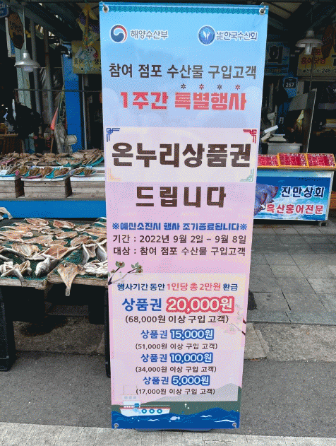 ÇÒÀÎ Çà»ç´Â Á¾ÇÕ¼ö»ê½ÃÀå ¼ö»ê¹° ÆÇ¸Å Á¡Æ÷¿¡¼ ±¹³»»ê ¼ö»ê¹°À» ±¸ÀÔÇÏ¸é ½ÃÀå ³» ȯ±Þ ºÎ½º¿¡¼ ¿µ¼öÁõÀ» È®ÀÎÇϰí, ´çÀÏ ±¸¸Å±Ý¾×ÀÇ ÃÖ´ë 30%¸¦(ÃÖ´ë 2¸¸¿ø) ¿Â´©¸®»óǰ±ÇÀ¸·Î ȯ±ÞÇÏ´Â ¹æ½ÄÀ¸·Î ÁøÇàµÈ´Ù.