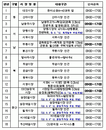ºÒ¹ýÁÖÁ¤Â÷ ´Ü¼ÓÀ» ¿ÏÈÇÏ´Â ÀüÅë½ÃÀåÀº ¡ãµ¿±¸ ´ëÀνÃÀå, »ê¼ö½ÃÀå, ³²±¤ÁÖ½ÃÀå ¡ã¼±¸ ¾çµ¿½ÃÀå, ÈÁ¤µ¿ ¼ºÎ½ÃÀå ¡ã³²±¸ ¹«µî½ÃÀå, ºÀ¼±½ÃÀå ¡ãºÏ±¸ ¼¹æ½ÃÀå, µÎ¾Ï½ÃÀå, ¿î¾Ï½ÃÀå, ¸»¹Ù¿ì½ÃÀå, µ¿ºÎ½ÃÀå ¡ã±¤»ê±¸ 1913¼ÛÁ¤¿ª½ÃÀå, ¼ÛÁ¤¸ÅÀϽÃÀå, ¼ÛÁ¤5ÀϽÃÀå, ºñ¾Æ5ÀϽÃÀå, ¿ù°î½ÃÀå, ¿ì»ê¸ÅÀϽÃÀå µî 18°÷ÀÌ´Ù.