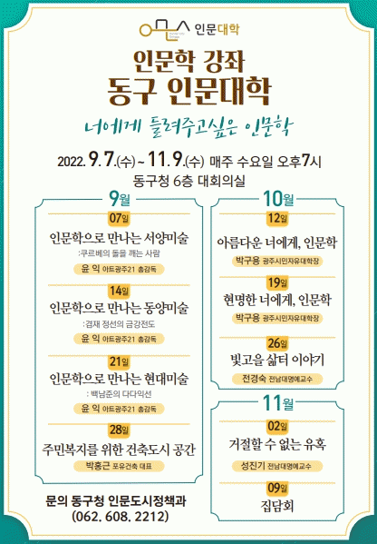 ¡®³Ê¿¡°Ô µé¿©ÁÖ°í ½ÍÀº Àι®ÇС¯À» ÁÖÁ¦·Î ÇÏ´Â ÇϹݱ⠵¿±¸ Àι®´ëÇÐÀº 7ÀϺÎÅÍ ¿À´Â 11¿ù 9ÀϱîÁö ¸ÅÁÖ ¼ö¿äÀÏ ¿ÀÈÄ 7½ÃºÎÅÍ 9½Ã±îÁö µ¿±¸Ã» 6Ãþ ´ëȸÀǽǿ¡¼ ÁøÇàµÈ´Ù.