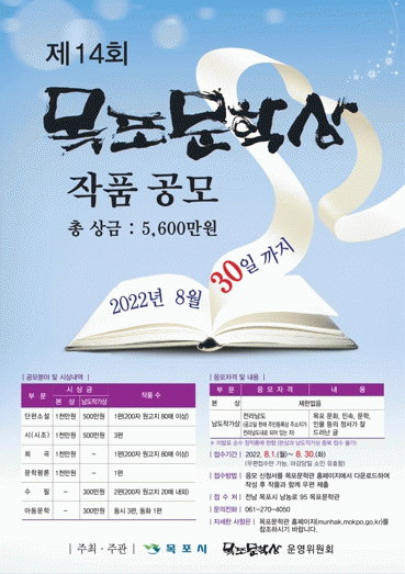 'Á¦14ȸ ¸ñÆ÷¹®Çлó'Àº °ø¸ð¸¦ ÅëÇØ ÀÛǰÀ» Á¢¼öÇß°í, ¸¶°¨ °á°ú ´ÜÆí¼Ò¼³, ½Ã, Èñ°î, ¹®ÇÐÆò·Ð, ¼öÇÊ, ¾Æµ¿¹®ÇÐ µî 6°³ ºÎ¹®¿¡ Àü±¹ÀÇ ½ÅÀÎ ¹× ±â¼ºÀÛ°¡ 700¸íÀÌ ÀÛǰ 1,540ÆíÀ» ÀÀ¸ðÇß´Ù.