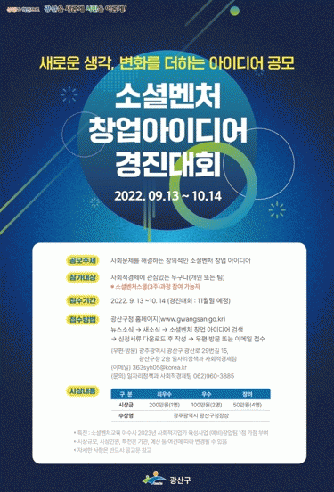 Âü°¡¸¦ ¿øÇÏ´Â °³ÀÎ ¶Ç´Â ÆÀÀº ±¤»ê±¸ ´©¸®ÁýÀÇ »õ¼Ò½Ä'¼Ò¼Èº¥Ã³ â¾÷ ¾ÆÀ̵ð¾î °æÁø´ëȸ °ø°í¹®À» Âü°íÇÏ¿© ½Åû¼ ÀÛ¼º ÈÄ ¿ìÆí¹æ¹® ¶Ç´Â À̸ÞÀÏ Á¢¼öÇÏ¸é µÈ´Ù.