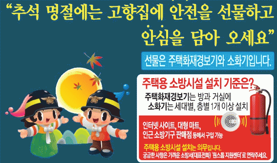 À̹ø È«º¸´Â °íÇâÁý¿¡ ¾ÈÀüÀ» ¼±¹°Çϰí, ¾È½ÉÀ» ´ã¾Æ ¿ÀÀÚ´Â ³»¿ëÀ» ÁÖÁ¦·Î »ï°í ½Ã¹Îµé¿¡°Ô °íÇâÁý ¾ÈÀüÀ» À§ÇØ ÁÖÅÃ¿ë ¼Ò¹æ½Ã¼³(¼Òȱâ, ´Üµ¶°æº¸Çü°¨Áö±â)À» ¼³Ä¡ÇÏÀÚ´Â ¸Þ½ÃÁö¸¦ ´ã¾Ò´Ù.