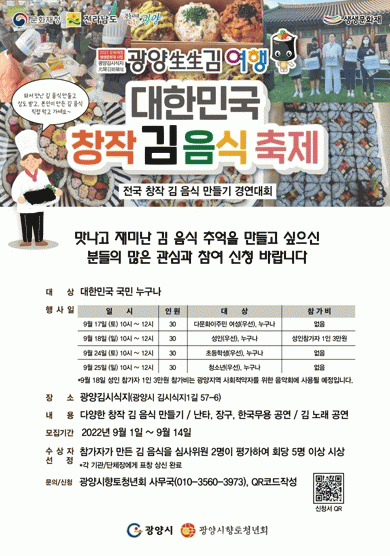 ±¤¾ç½Ã°¡ ÁÖÃÖÇÏ°í ±¤¾ç½Ã ÇâÅäû³âȸ°¡ ÁÖ°üÇÏ´Â 2022³âµµ ¹®ÈÀçû »ý»ý¹®ÈÀç ¡®±¤¾ç ßæßæ ±è ¿©Ç࡯ »ç¾÷ÀÇ µÎ ¹øÂ° ÇÁ·Î±×·¥À¸·Î ÃßÁøÇÏ´Â ¡®´ëÇѹα¹ âÀÛ ±è À½½Ä ÃàÁ¦¡¯´Â ¡®¸ÀÀÖ´Â ±è À½½Ä ÇÔ²² ¸¸µì½Ã´Ù¡¯¸¦ ÁÖÁ¦·Î °³ÃֵȴÙ.