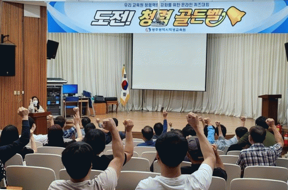 ±¤ÁÖÇлý±³À°¿ø Á÷¿øµéÀº 9¿ù ¿ù·ÊÁ¶È¸ ½Ã°£¿¡ ÀÚ¼º°ü(°´ç)¿¡ ¸ð¿© ¸ð¹ÙÀÏ ¸Þ½ÃÁö(Ä«Åå)¹æÀ» ÅëÇØ û·Å°ñµçº§ URLÁÖ¼Ò¿¡ Á¢¼ÓÇϰí ÄûÁî Ç®À̸¦ ½ÃÀÛÇß´Ù. ÃÑ 10¹®Á¦ÀÇ Ç®ÀÌ °á°ú, ¼ºÀû¿ì¼öÀÚ 5¸í¿¡°Ô´Â °ñµçº§»ó, ³ë·Â»ó 5¸í¿¡°Ô´Â ¿Â´©¸®»óǰ±ÇÀ» ¼ö¿©Çß´Ù.
