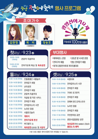 ù° ³¯ÀÎ 9¿ù 23ÀÏÀº °ü±¤°´À» À§ÇÑ ÁïÈï ¹«´ë¿Í ±¤¾çÀü¾î°¡¿äÁ¦ ¿¹¼±ÀÌ ÆîÃÄÁö°í, µÑ° ³¯ÀÎ 9¿ù 24ÀÏÀº Áø¿ùdz¹°´Ü »ç¹°³îÀ̸¦ ½ÃÀÛÀ¸·Î ÃàÁ¦Àå¿¡¼ °¡Àå Å« Àα⸦ ²ø°í ÀÖ´Â Àü¾îÀâ±â üÇè, Àü¶ó³²µµ ¹«Çü¹®ÈÀç Á¦57È£ÀÎ Àü¾îÀâÀÌ ¼Ò¸® ½Ã¿¬, Àú±Û¸µ°ú ÀÛÀº ¼Ä¿½º, º¸µðºô´õ ¼î, ±¤¾çÀü¾î°¡¿äÁ¦ º»¼±°ú ÃÊ´ë°¡¼ö ÃàÇϰø¿¬ÀÌ ÁøÇàµÈ´Ù.